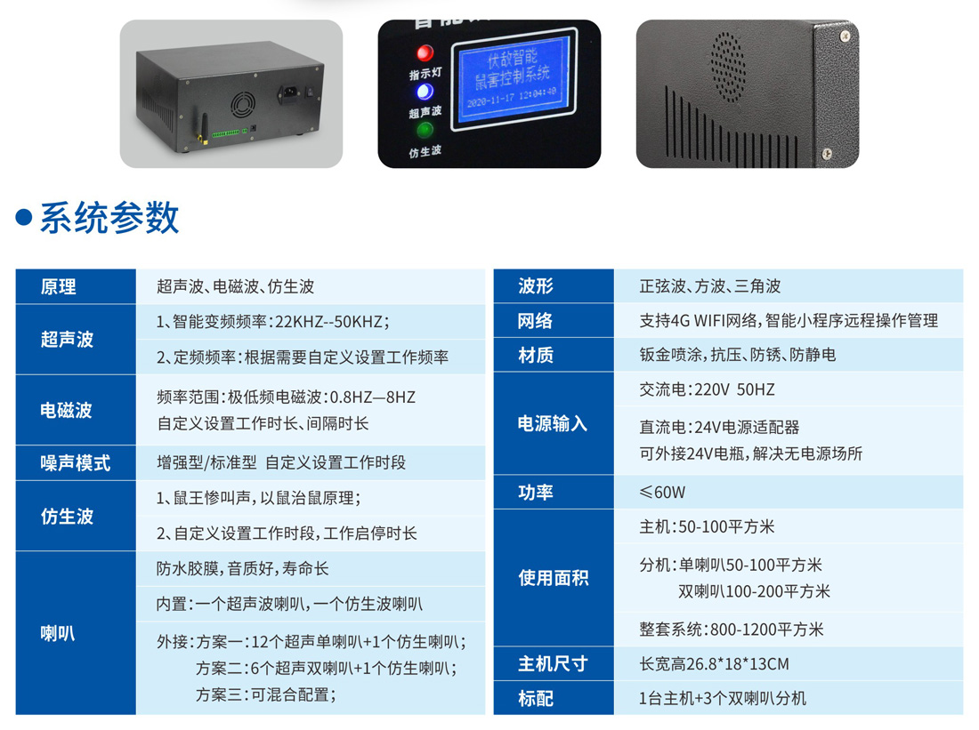采用超聲波、電磁波、仿生波原理,是復合型多功能產品,主機內置1個超聲波喇叭+1個仿生波喇叭,可外接12個超聲波喇叭+1個仿生波喇叭。功率60W,聲壓強、分貝高,可滿足大面積復雜環境使用,多工作模式,在無人時段或區域可啟用噪音模式、仿生模式,可提高驅鼠效率。本系統需要長期不間斷使用,可達到良好的驅鼠防鼠效果,控制老鼠密度,降低鼠損,解決企業鼠患的危害。
